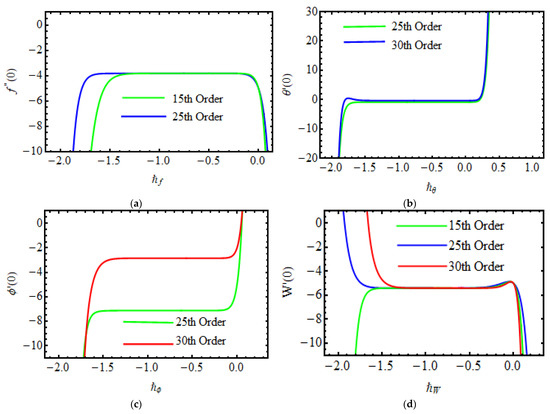 HAM was used to investigate the explicit and analytic solutions of Equations (16)–(19) [51]. This analytical technique is quite effective and flexible in solving the parabolic-type boundary value problems of any order, is unconditionally stable, and attains remarkable accuracy. Taking the initial guesses and the linear operators as