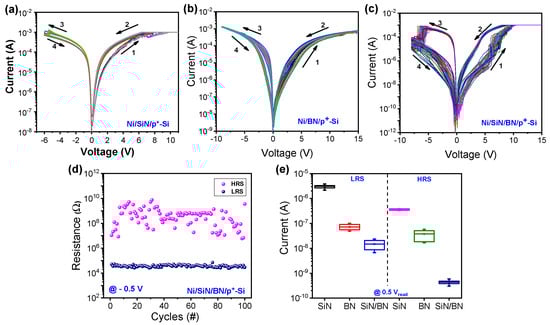 Typical I-V characteristics of (a) Ni/SiN/p+-Si, (b) Ni/BN/p+-Si, and (c) Ni/SiN/BN/p+-Si devices. (d) Endurance of Ni/SiN/BN/p+-Si device. (e) LRS and HRS distribution of three devices.