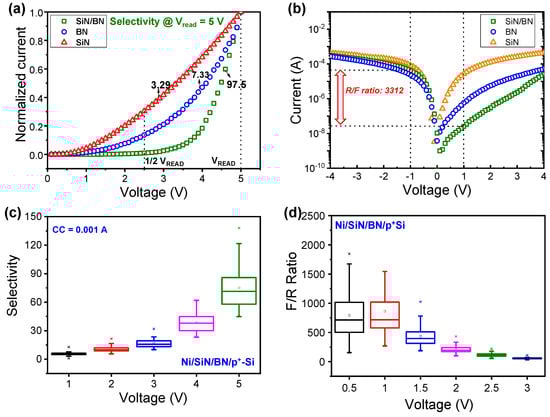 Selectivity and F/R ratio of Ni/SiN/p+-Si, Ni/BN/p+-Si, and Ni/SiN/BN/p+-Si devices in LRS: (a) normalized current curves of selectivity and (b) I-V curves for F/R ratio. (c) Selectivity and (d) F/R ratio as a function of read voltage.