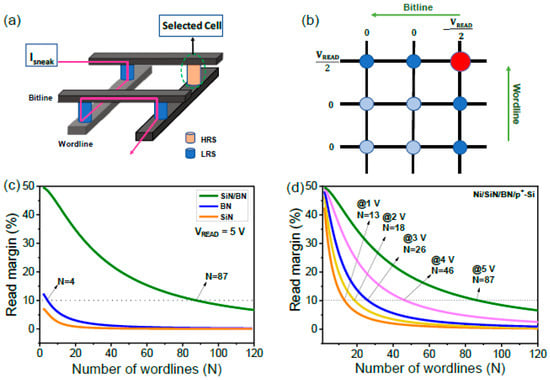 (a) Schematic of cross-point array illustrating sneak current. (b) Half-bias read scheme of cross-point structure. (c) Read margin with number of word lines of Ni/SiN/p+-Si, Ni/BN/p+-Si, and Ni/SiN/BN/p+-Si devices. (d) Read margin with number of word lines of Ni/SiN/BN/p+-Si device at different read voltages (1 V, 2 V, 3 V, 4 V, and 5 V).
