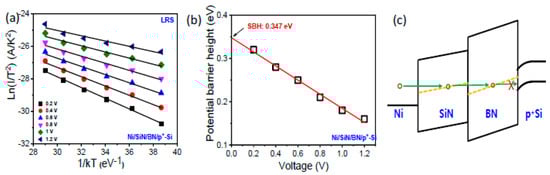 where J is the current density, A* is the effective Richardson constant, T is absolute temperature, q is the electron charge, ΦB is effective barrier height, E is the electric field, εr is dynamic dielectric constant, ε0 is the dielectric constant of free space, and kB is Boltzmann constant. Each voltage barrier height can be extracted from the slope of the ln (I/T2) versus 1/kT plot in Figure 5a,b. In LRS, many traps can be generated around the midgap of the dielectrics when conducting defects are induced in the SiN and BN layers by the set process. This allows carriers to move through the trap, as shown in Figure 5c [15]. When a positive bias is applied to a SiN/BN device, the holes from Ni TE can tunnel into the SiN and BN layer trap state and then be blocked by a Schottky barrier in the p+-Si.