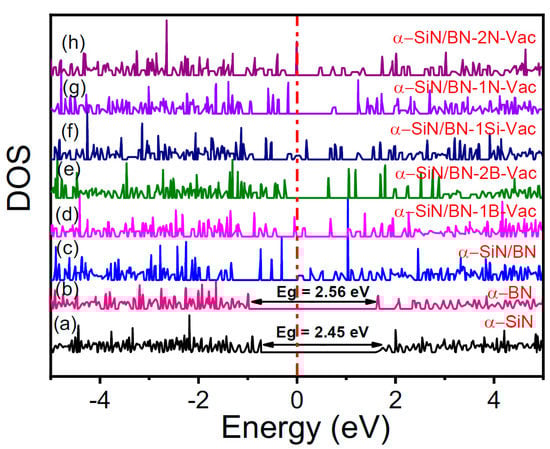 Density of states (DOS): (a) α-SiN, (b) α-BN, (c) α-SiN/BN, (d) α-SiN/BN-1B-Vac (Vacuum), (e) α-SiN/BN-2B-Vac, (f) α-SiN/BN-1Si-Vac, (g) α-SiN/BN-1N-Vac, (h) α-SiN/BN-2N-Vac. (N is effective density of function).