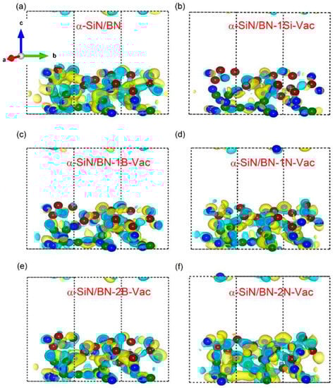 Iso-surface charge density. a, b, c axis means x, y, z axis of the device: (a) α-SiN/BN, (b) α-SiN/BN-1Si-Vac, (c) α-SiN/BN-1B-Vac, (d) α-SiN/BN-1N-Vac, (e) α-SiN/BN-2B-Vac, (f) α-SiN/BN-2N-Vac.