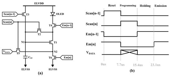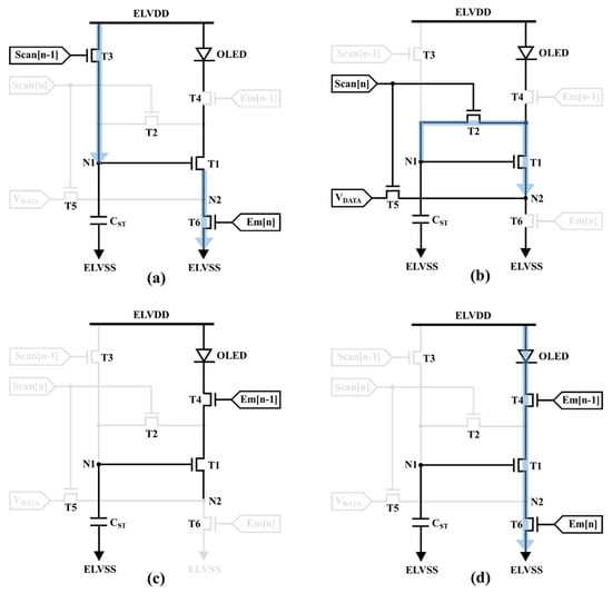 Figure 1a shows the circuit construction of the proposed 6T1C LTPO pixel circuit, which adopts the top-anode OLED configuration or the inverted top-emitting OLED (ITOLED) structure [,]. The proposed 6T1C pixel circuit is composed of one driving LTPS TFT (T1), two switching LTPS TFTs (T4 and T6), three switching oxide TFTs (T2, T3, and T5), and one storage capacitor (CST). Furthermore, nodes N1 and N2 are the DTFT’s gate (VG) and source voltages (VS), which play an important role in controlling pixel currents. The corresponding timing diagram is shown in Figure 1b. To reduce the complexity of the pixel circuit, both Scan[n] and Scan[n − 1] control signals (Em[n] and Em[n − 1]) have the same pulse width. The operation of the proposed circuit is divided into four phases, as shown in Figure 2, presented in detail as follows.