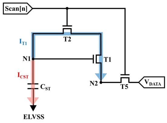 where VN1 is the voltage of N1 as well as the voltage being stored in CST. In addition, as the Scan[n] signal turns on T2 and T5, a data voltage is supplied to N2 through T5. The diode-connected structure starts discharging N1 from ELVDD to VDATA + VTH_DTFT in an ideal operating situation. The discharging current (IT1) can be presented as