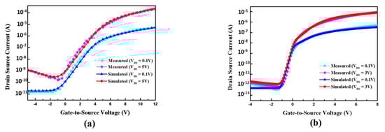 Measured and simulated (a) LTPS TFT and (b) a-IZTO TFT transfer curves.