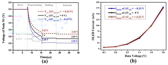 Figure 5a shows the simulated transient waveforms of node N1 of the proposed pixel circuit operating at 120 Hz when VTH variations in DTFT are −0.33, 0, and +0.33 V. Node N1 is reset to ELVDD (5 V) at the start of the operation and then discharged to approximately VDATA + VTH (3 V) with an input data voltage of 1.5 V after the programming period. Furthermore, the proposed circuit senses variations of 0.33 and 0.32 V, which are nearly equal to the actual variation of 0.33 V. Furthermore, at the end of the holding period, node N1 drops from 3 to 2.85 V due to the parasitic capacitance issue caused by clock-feedthrough effects. Figure 5b shows the simulated OLED currents versus data voltage from −0.1 to 1.9 V for ±0.33 V DTFT threshold voltage shifts with an average error rate of 1.8%, demonstrating the proposed pixel circuit’s high compensating capability for threshold voltage variations when driven at 120 Hz.