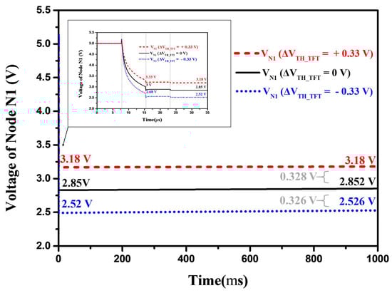 Figure 6 depicts the simulated voltage waveforms of node N1 operating at a low frame rate of 1 Hz when the VTH variations in the driving TFT are −0.33, 0, and +0.33 V. After the reset, programming, and holding operations, the voltage of node N1 ought to be sustained within the long period emission stage of 1 s. It can be seen that the voltage of node N1 is fine and holds that the maximum variation is about 0.23%. Furthermore, at the end of the emission period, the proposed circuit detects voltages of 0.328 V and 0.326 V, indicating that the proposed pixel circuit is highly resistant to DTFT threshold voltage variation when driven at a low frame rate of 1 Hz.