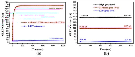 (a) Simulated OLED currents with a long emission time of 1 s using all-LTPS TFTs or LTPO structure for the proposed pixel circuit. (b) Simulated OLED currents with a long emission time of 1 s at low, medium, and high gray levels for the proposed 6T1C pixel circuit.