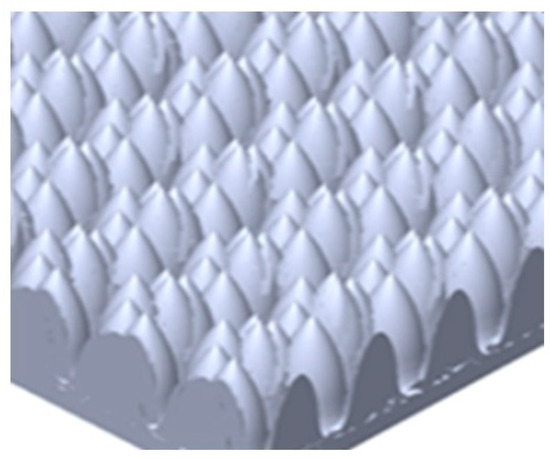 An optical diffuser diffuses light by shuffling its wavefront and reducing its spatial coherence. It acquires random or pseudo-random fluctuations in the optical phase for different parts of a given incoming light profile [9]. When a highly spatially coherent laser beam collides with a diffuser, the light emitted by the diffuser may lose its beam characteristics and move in a wide range of directions. The degree and specific properties of diffusion, on the other hand, might vary significantly among devices [10]. Optical diffusers come in a variety of geometrical forms to suit a variety of purposes. Diffuser plates, for example, are typically round or rectangular in shape with a thin thickness of a few millimeters [11,12] There are also diffuser coatings that may be applied to a variety of surfaces, including metals and plastics [13]. The diffuser was created and developed using epoxy as the lens, which has transparent behavior and a microstructured shape on top of the lens. Figure 2 shows the SEM image of the microstructure of the diffuser on the lens.