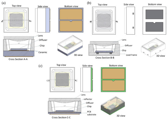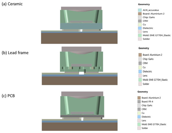 where E is the modulus and ϵ the mechanical strain from thermal loading. The package was simulated under mechanical stress during the resistance to soldering heat (RTSH) process. Three different materials were introduced: ceramic, lead frame, and printed circuit board (PCB). All of the packages are identical, and the diffuser was grown or formed on top of the chip rather than the lens as in the prior packaging. Supporting other materials, including epoxy for the lens and adhesive, are classified as conductive or nonconductive. The whole package, including the diffuser, was generated by using SolidWorks 2017 and AutoCAD 2017. The dimensions of all packages were ensured to meet the manufacturing capabilities for semiconductor backend processes such as die-attached (DA), wire- bond (WB), lens-attached, and potting with requirements for measurement within a Six Sigma process specification. According to automotive specifications, the maximum temperature stain for the inner component as a dashboard component is only 200 °C [17]. Therefore, to ensure the robustness of the package, the measurement temperature ranges were chosen to be between −40 °C and 260 °C.
