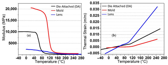 The structural design and mechanical stress modeling, using various forms of packaging for VCSEL packaging utilized the 1 mm2 chip and the novel. Table 1 shows the structure and list of materials for each form of packaging, with all materials, including the lens and adhesive being the same for all packages. They are expressed in terms of thermal conductivity (W/m.K), coefficient of linear thermal expansion (CTE), and modulus (MPa); in addition, the behavior and characteristics stated are linear elastic. Thermomechanical Analysis (TMA)1 and Dynamic Mechanical Analysis (DMA)2 are methods for measuring the properties of materials based on temperature and pressure changes, such as epoxy for die attachments, lens, diffusers, and dielectrics, as illustrated in Figure 6a,b. The diffuser material was employed in the same way as a lens would be, with translucent characteristics. The reflector is solely used for PCB package and is built of black polyphthalamide moulded metallized (PPA) with a thin surface gold coating to prevent light absorption.