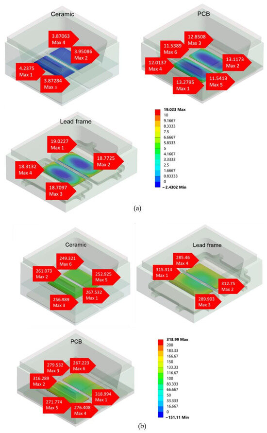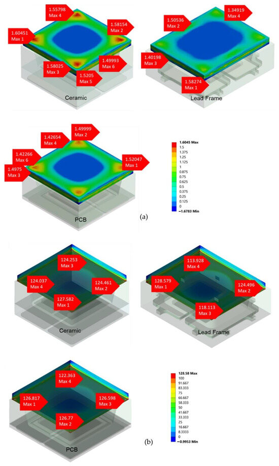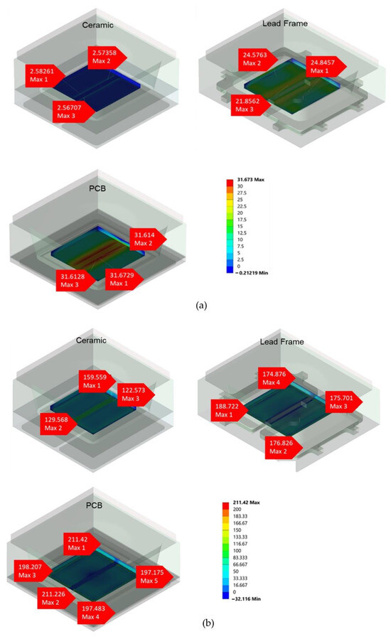 The chip, which is considered the middle of the package, was the next area that was assessed. Similarly, the die-attached surface, chip, and lens were assessed for the principal stress for each type of package. At RSTH, none of these stress value differences were significant for all packages, as the range of stress values started from 0 to 31.673 MPa at higher temperatures, and at lower temperatures, the value of stress for all packages started from 0 to 211.42 MPa. In contrast to lead frame and PCB, ceramic packages have lower stress values of 2.567 MPa at higher temperatures. Figure 10a,b depicts the stress value at higher and lower temperatures, respectively. The stress values vs. temperatures for all packages are shown in Figure 11.