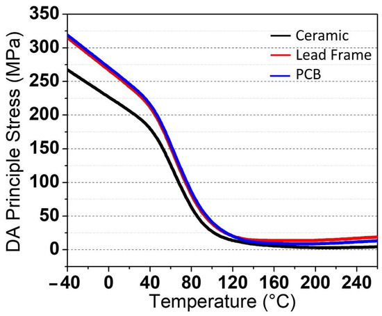 There is no substantial difference between all the packages with a wide range of temperatures. At higher temperatures, the range of values for stress on all packages is 0 to 19.023 MPa, whereas at lower temperatures, it is 0 to 318.99 MPa. The stress values are uniform and homogenous throughout. Figure 8a,b depicts the mechanical stress simulation for die-attached (DA) in principal stress during the RTSH at 260 °C and −40 °C, respectively, and the graph in Figure 9 depicts the stress value for the package versus temperature.