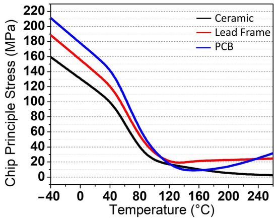 Chip surface stress values versus temperatures ranging from −40 °C to 260 °C during the mechanical stress simulation.