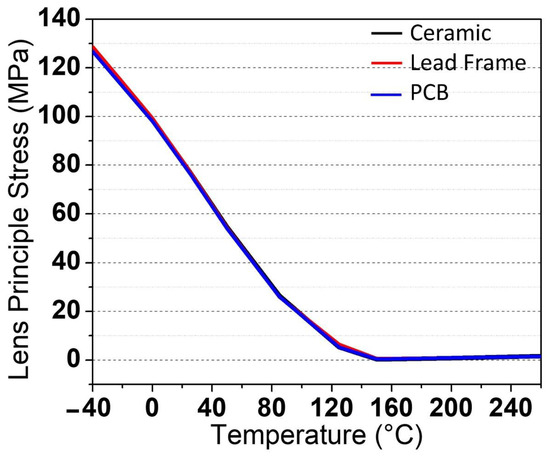 Stress values of lens versus temperatures ranging from −40 °C to 260 °C during the mechanical stress simulation.