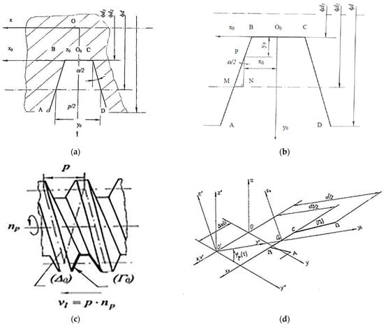 Figure 2a shows the standard generator profile for trapezoidal threads. Here, O0x0y0z0 is the local (mobile) coordinate system, and Oxyz is the general (fixed) coordinate system on the thread axis. The mathematical description of the generator profile is based on representation from Figure 2b. Generation of idealized helical surface (Σ0) was considered as in Figure 2c, by sweeping the cutter edge generatrix (Г) along the whirling helical directrix (Δ). For (Σ0) modeling, three coordinate transformations were applied, as in Figure 2d, respectively: origin translation from O0 to O’, rotation of φp angle around O’x’ axis, and origin translation from O’ to O, where O’x’y’z’ is an intermediate coordinate system.