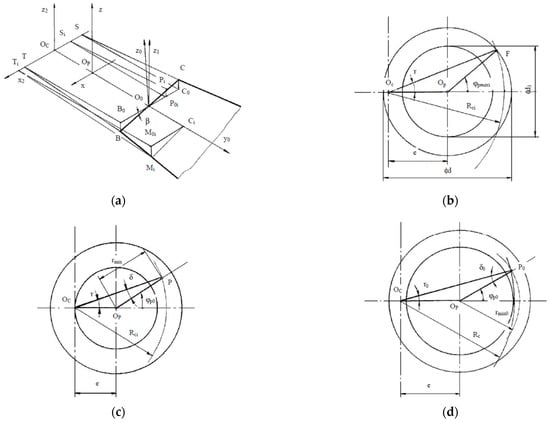 For (Σq) modeling, six-coordinate transformations were applied, as in Figure 2e, respectively: origin translation from O0 to the center of cutters’ disposal Oc, rotation of φc angle around the axis of the whirling head, rotation of β angle around Ocy1 axis corresponding to whirling head tilting, origin translation from Oc to O4 corresponding to longitudinal feed, origin translation from O4 to the workpiece axis in Op, and rotation of φp angle around the workpiece axis.