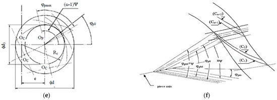 In Figure 3, the notations represent as follows: RCi is the radius of the approximated trajectory of a generator point Mi from the tool cutting edge, φpmaxi is the contact half-angle for a generator point Mi, φp0 is the angular position of the axial section plane considered for the study, rmin is the minimum radius of the theoretical profile generated by a cutter in an axial section plane, n is the number of theoretical helical surfaces intersecting a particular axial plane, φpM and φpm are the extreme angular positions of the first order generative intersection curve (C1). The other notations are nominated as above.