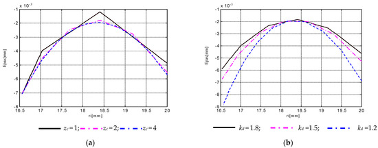 Theoretically modeling and numerically simulating the complex helical surfaces generation at thread whirling, as presented above, allowed the study of several micro-geometric accuracy elements such as the following: the profile errors on the thread flank, in axial section plane, symbolized as Epax (mm); the profile error on the pitch diameter, symbolized as Epdm (mm); the scallop height on the thread flank, in axial section plane, symbolized as hmax (μm); and the local error of the helix pitch, symbolized as Eph0 (mm). As influence factors upon these theoretical errors, the following set of machining conditions were considered: the thread pitch p (mm), the thread external diameter d (mm), the number of cutters on the whirling head zc, the diameter coefficient of whirling process kd defined as the ratio between the diameter D of cutters’ top edge disposal, and d, the whirling head tilting angle β (°), the rotary speed of whirling head nc (rpm) and the rotary speed of workpiece np (rpm). Hereby, the distribution of the profile errors Epax along the thread flank highlighting the influence of parameters zc and kd is exemplified in Figure 4. Some results on the surface irregularities, respectively, on the scallop heights on the thread flank hmax, in axial section plane, were discussed in a previous paper [48].