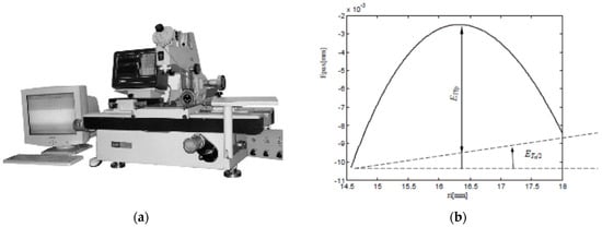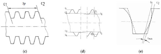 Something similar was carried out for the thread groove bottom (see Figure 3d). The exact value for rmin was determined by intersecting the helical theoretical curve (Ei) corresponding to the trajectory of the considered generator point with the considered axial plane. It was intended to solve the following system of equations: