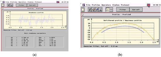 Roughness measurement result example: (a) roughness profile and roughness parameters; (b) unfiltered profile versus waviness profile.