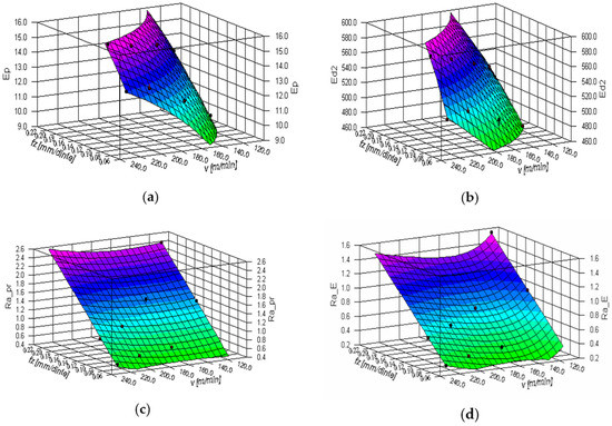 Measured data from the experiments presented in Table 3 are shown in Table 5. They were processed with the DataFit software tool and mathematical expressions of bi-dimensional dependencies on machining parameters v and fz were obtained. The models for the influences on parameters Ep, Ed2, Ra_pr, and Ra_E are given in Equations (16)–(19).