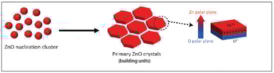 Nucleation and growth scheme of ZnO nanoparticle building units.