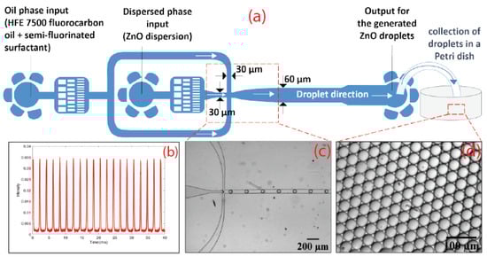 The as-synthesized ZnO nanoparticle dispersion was then used to produce highly monodisperse droplets of ZnO nanoparticles, as illustrated in Figure 2a. The continuous phase (carrier fluid) consisted of a fluorocarbon oil HFE 7500 (3-ethoxy-dodecafluoro-2-tri-fluoro-methyl-hexane), which contained 2% wt. of a fluorosurfactant (dSURF), which was purchased from Fluigent (France). It is worth noting that fluorocarbon oil HFE 7500 is a highly chemically inert oil, purchased from Inventec (France), with a much higher mass density than water (1.61 g/cm).