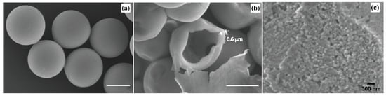 (a) SEM images of 16.5 m zinc oxide microcapsules obtained from 62 m droplets; (b) shell thickness was found to be approximately 0.6 m; (c) high-magnification SEM on shell microcapsules showing the size of ZnO NPs building blocks of approximately 100 nm. Scale bars: (a,b) 10 m, (c) 0.3 m.