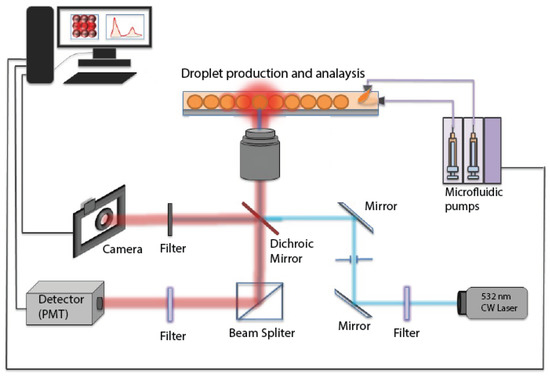 Optofluidic setup used for real-time fluorescence measurements recorded from flowing droplets in the microfluidic channel.