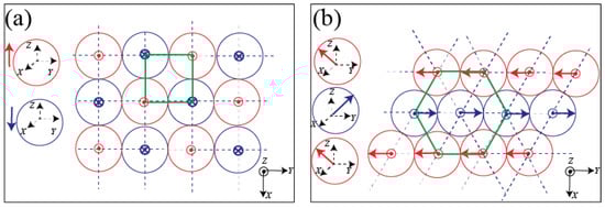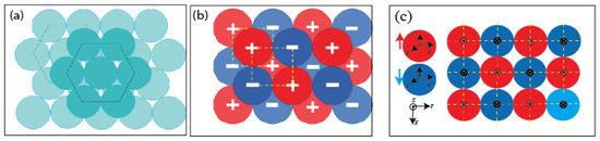 Schematic illustration of ZnO microdroplet organizations in hexagonal (a) and square (b,c) lattices. In (c), the ‘·’ dot sign surrounded by a circle in red spheres represents an electric dipole oriented upwards (along the direction of the z-axis), whereas the ‘×’ cross sign surrounded by a circle in blue spheres represents a downward-oriented electric dipole (along the opposite direction of the z-axis).