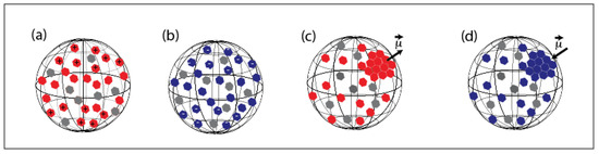 (a) Positive and (b) negative surface-charged models of droplets for which NPs are homogeneously distributed around the droplet, unlike in dipolar droplet models (c,d); grey color is used for NPs with either a positive surface charge (upwards orientation) or with a negative charge (downwards orientation). For each model, the majority of NPs are oriented either upwards or downwards, in a such way that a global surface charge is obtained: , , and .
