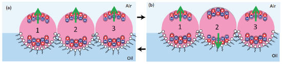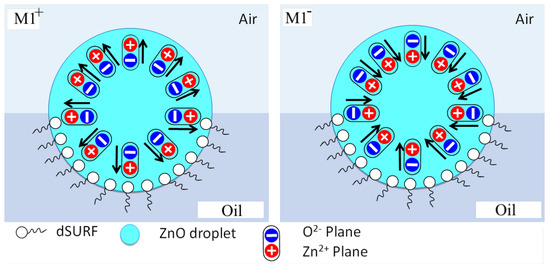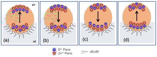 Figure 7 shows different organization models of ZnO NP building units that may lead to the formation of surface-charged droplets and dipolar droplets at the droplet/oil and droplet/air interfaces. For the ‘surface-charged’ droplet model, one needs to assume the formation of two types of microdroplets with two opposite surface electrical charges: one with ZnO nanoparticles having, as a majority, their planes oriented outwards (upwards) with regard to to the droplet interface—see Figure 7a—and the second (with a negatively charged surface) would be obtained according to the organization of ZnO nanoparticles with a ‘downwards’ orientation, as illustrated in Figure 7b.