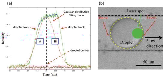 In fact, the observed asymmetric shape of the fluorescence peak may be interpreted easily based on the well-known tip-streaming effect in droplet microfluidics [27,28,29]. Indeed, it is well known that, in the presence of a surfactant, the recirculation flow induced by the motion of the droplet in the viscous carrier oil generates a heterogeneous distribution of the surfactant at the droplet interface: the surfactant’s interfacial density becomes higher at the rear region of the droplet than at its front, as illustrated in Figure 13a,b. Baret et al. [34] reported, for instance, a decade ago, direct evidence of the accumulation of surfactant molecules at the backs of droplets in the flow of a perfluorinated carrier oil. These authors used a home-made fluorescent non-ionic surfactant to monitor the build-up of the surfactant monolayer at the water/oil interface by the readout of the droplet interface fluorescence. In a more recent study, Hayat and El Abed [33] have shown that the accumulation of an ionic surfactant could be indirectly demonstrated by the accumulation of charged rhodamine B molecules at the back of the flowing droplets.