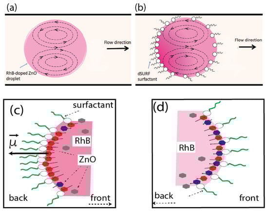 Because of the demonstrated accumulation of RhB molecules at the rear part of the droplet/oil interface and the electric charges carried by RhB molecules, we suggest that the higher density of RhB molecules at the rear parts of the droplets enhances the screening of repulsive electric interactions between parallel-oriented electric dipoles, enhancing therefore the parallel orientation of ZnO NPs at the rear part of the droplet interface, as illustrated in Figure 13c. Inversely, because of the depletion of surfactant and RhB molecules at the front parts of the flowing droplets, electric interactions between ZnO nanoparticles are less screened and a tail-to-head (anti-parallel) orientation should be favored, as illustrated in Figure 13d.