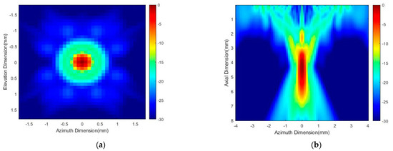 where is the intensity at FWHM, K is a constant value mostly equal to 1, is the F-number of the system, f is the frequency of the ultrasound, and v is the speed of sound in the medium, in this case, the retinal tissue area. Based on Equation (11), we can place our array transducer as near as possible to the cornea and increase the aperture so that is decreased and thus improve the spatial resolution.