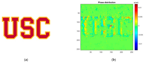 Figure 7a,b shows the letter “USC” as the inputs image with 256 × 256 pixels of our system [46] and the corresponding phase diagram of input image as a hologram, respectively. Figure 7c,d show the acoustic field power distribution pattern with 5 MHz and 20 MHz, respectively. The dimension of output pattern is 8.96 mm × 8.96 mm which is match with the size of input image. Each pixel is corresponding to half lambda wavelength of 20 MHz ultrasonic wave. The weighted GSW algorithm is used to generate the pattern with the excitation acoustic field presented in the last section.