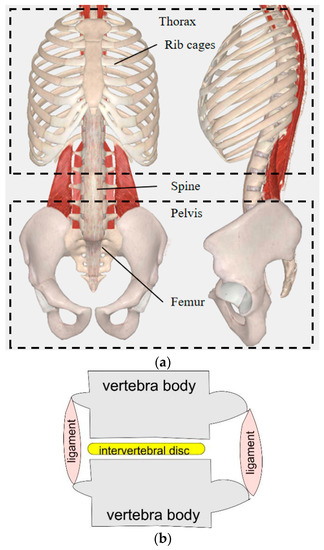 Schematics of the human torso: (a) skeleton structure; (b) the spine unit.