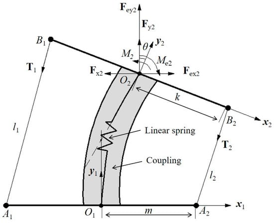 Two Cartesian coordinate systems are assumed on the fixed vertebra and moving vertebra as O1x1y1z1 and O2x2y2z2, respectively. The O1 and O2 are at the centers of the vertebras. The mechanism does not have motion in the Z direction, and therefore the analysis is conducted at the Oxy plane only. The rotation angle of the moving vertebra B1B2 is θ as per rotating around the Z axis. A model for force analysis at the point O2 is presented in Figure 3 yet with actions at point O2 as Fxi, Fyi, and Mi when i equal to 2. Fx2, Fy2, and M2 are the forces and torque at point O2 from the effect of linear spring; Fex2, Fey2, and Me2 are the external forces and torque at the point O2 as coming from payload and external actions. The external actions can be generated as Fe and Me are due for example to interactions from the environment. T1 along A1B1 is the tension on cable with the length l1. T2 is the tension on A2B2, whose length is l2. The length m is t T1 is the tension on cable A1B1 with the length l1. T2 is the tension on A2B2, whose length is l2. The m distance is the size of O1A1 and O1A2. The k distance is the size of O2B2 and O2B1. Using the closed-vector loop model, the relative motion of the vertebra links can be expressed using position vectors Li of li as