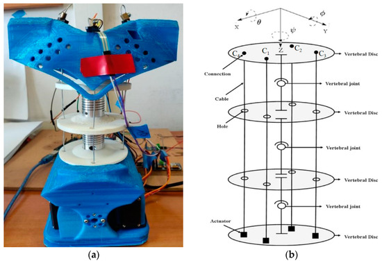 According to the scheme in Figure 2, Cafolla et al. [19,23] designed a humanoid torso with a humanoid spine by combining three vertebra-spring cable-driven mechanisms, as shown in Figure 4b. The design solution consists of four cables, four servo motors, four vertebras, three vertebral joints, and supporting elements. Based on the characterization of the human torso in Figure 1, the humanoid LARMbot torso V1 was manufactured by using a 3D printer and market components, as shown in Figure 4a. The whole prototype is 154 × 113.8 × 261.3 mm. Couplings are used as springs, providing the support and torsion for the mechanism. Each servomotor drives a cable with the corresponding antagonist so that the structure works with 3-dof motion [23].