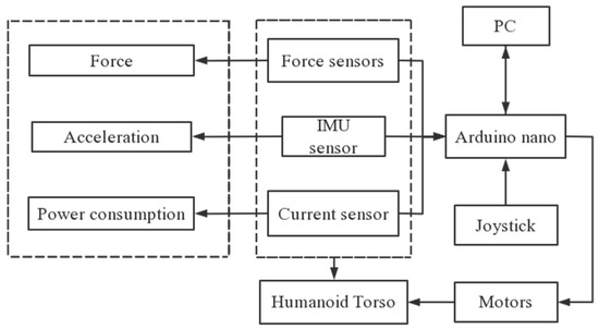 The control system of the LARMbot V1 torso consists of Arduino boards, PC, and sensors and is used also as the testing set up for monitoring the tests as shown in Figure 5. The testing layout in Figure 5 is designed to use the sensorization in the LARMbot torso V1 design within a proper testing frame. In particular, the IMU sensor and current sensor are those that are included in the control system, while the force sensors are installed at the top connection of the cables. This sensorization for testing has been arranged with the aim also not to affect the typical operation of the torso while extracting performance data in terms of motion characteristics and force transmission. Thus, the sensors are included in the torso design whose motion is given by servo motors that are controlled through an Arduino Mega by PC or a joystick.