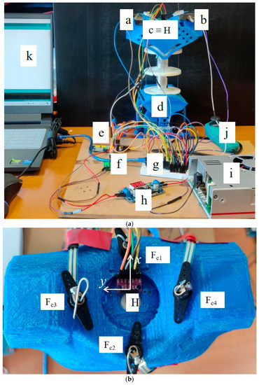 Four force sensors (Fc1 & Fc2; Fc3 & Fc4) are located at suitable positions for measuring the forces between the cables and shoulder. Figure 6b illustrates the distribution of force sensors on the shoulder body. The type of the force sensor is RP-C7.6-LT model, [24], which is flexible ultra-thin, has ultra-low power consumption, extreme speed response, and high stability. The pressure induction range is 20 g ~ 1.5 kg. The activation time is less than 0.01 s. The response time of it is less than 10 ms. An IMU sensor, [25], is placed on the center of the shoulder body, which is indicated as point c in Figure 6a. The current sensor f in Figure 6a is used to calculate the power changes during the testing. The type of the current sensor is ACS 712, [26], which can measure the current from −5 A to +5 A. The PCA9685 board, [27], in e position in Figure 6a is used to connect driving servomotors the Arduino board in g. The Arduino board is also used to collect and manage the acquired data from the sensors to a laptop.