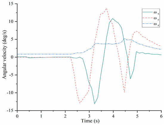Figure 8 shows that the angular velocities of shoulder body as acquired by the IMU at point H change a lot during the full rotation test since the start at around 2.7 s with a proper time evolution. The angular velocity ωx starts to decrease and at about 3.2 s reaches a minimum value of about −14 deg/s whereas the maximum is detected of about 11 deg/s. Then it decreases again until about 4.7 s. Finally, the curve increases to 0 deg/s at the rest position. The angular velocity ωy shows the same trend of ωx but reaching to maximum and minimum values earlier than ωx. When the time is about 2.6 s, ωy reaches the first maximum value of around 13 deg/s. Then, at about 3.5 s, the maximum value of ωy is about 14 deg/s. When the time is around 4.5 s, the third maximum value is detected of about 10 deg/s, from which ωy decreases to about 7 deg/s after the time is about 5 s. The values of ωx and ωy change several times accordingly to the sequence of bending movements. The value of ωz does not change significantly during the tested full rotation motion since the full rotation does not include twisting of the torso. As the time near 2.5 s, ωz increases until around 4.7 s when it decreases to about 1 deg/s. The maximum values of angular velocities are less than 15 deg/s well reflecting the smooth operation of the full rotation mode with the expected cyclic time evolution.