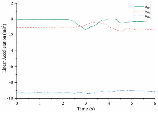 The acquired linear acceleration components of shoulder point H are reported in Figure 9. The linear acceleration aHz does not change significantly form the sensed gravity acceleration. On the contrary, aHx and aHy show significant variations. When the time is about 2.3 s, aHx starts to decrease and reaches the minimum value of about −1.8 m/s2 when the time is about at 3 s. After that, it increases and stays at a constant level after 4.5 s aHy increases when the time is about 2.5 s and at about 3.5 s reaches a maximum of about −0.3 m/s2. Then, it decreases to −1.9 m/s2. And after that shows a small increase up to a quasi-constant value. The time evolution with those limited acceleration values well describes the time evolution during the full rotation torso motion.