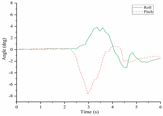 Figure 10 shows that the time evolution of the angles in pitch and roll with significant variations well corresponding to the previous results reflecting the feasible characteristics of human-like motion in the torso full rotation. The roll angle starts to increase when the time is about 2.3 s. When the time is about 3.3 s, it increases to maximum of about 4 deg. After that, it decreases until the time is about 4.5 s and then, a last variation from about −3 deg to about −0.5 deg. Finally, it does not change significantly after 5 s. The pitch angle starts to decrease when the time is about at 2.3 s and at about 3 s it reaches the maximum value of about −8 deg at the opposite direction. After that, it increases until about 4 s. and finally, it decreases from 1 deg to about −1 deg that remains quasi constant.