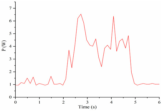 The computed power of servomotors is reported in Figure 11. The power starts to increase at about 2 s when the servomotors start to work. When the time is about 2.7 s, it reaches the maximum of about 5.8 W. Then, it decreases and reaches a new maximum of about 6.5 W when the time is about 4.2 s. After 5 s, the power remains at a constant value of about 1 W. During the torso full rotation, the four servomotors work together most of the time. The values of power are larger than in bending left and right or forward and backward and therefore, completing the full rotation motion requires more power.