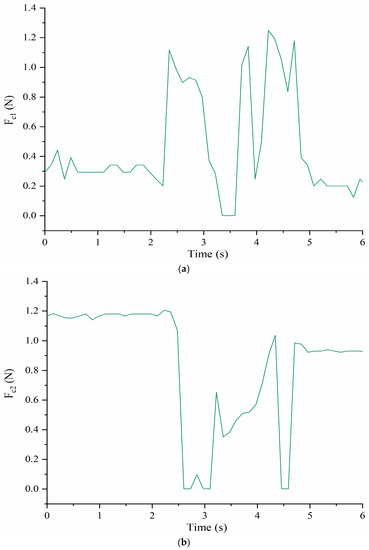 Figure 12 shows the measured forces Fc1 and Fc2 between the cables and shoulder body. Fc1 starts to increase when the time is about 2.3 s at the same time that Fc2 decreases as per the antagonist action. When the time is about 2.5 s, Fc1 reaches maximum value of about 1.1 N while the cable C2 loses tension with Fc2 going to 0 N. Around 3 s, Fc1 starts to decrease, and t Fc2 changes in the opposite way. When the time is about 4.5 s, a similar situation happens again. After 5 s, Fc1 and Fc2 remain at a constant level of about 0.2 N and 1.0 N, respectively.