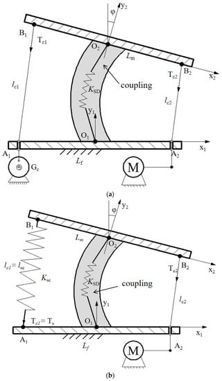 The first, with a torsion spring at Gc, is shown in Figure 15a. It consists of two vertebras, two cables, a flexural spring, a drum with a torsion spring, and a servomotor. The A1A2 is the fixed vertebra with the length Lf. The cables with length lc1 and lc2 go through the fixed vertebra and connect with drum Gc and servomotor, respectively. The moving vertebra B1B2 with length Lm can perform motions via cooperation with the servomotor and the drum with torsion spring. The ϕ angle of the moving vertebra shows the relative motion between two vertebras. The tension forces on cables are indicated as Tc1 and Tc2. The vertebra-disc unit can complete motion in several steps. For example, when the servomotor rotates 90 deg, the unit is at the home position; when the servomotor rotates 0 deg, the moving vertebra bends right; and when the servomotor rotates 180 deg, the moving vertebra bends left. During this operation, a drum with a torsion spring will rotate with a proper balancing force to keep the cable under tension. To obtain the desired functionality, the torsion spring should be sized appropriately.