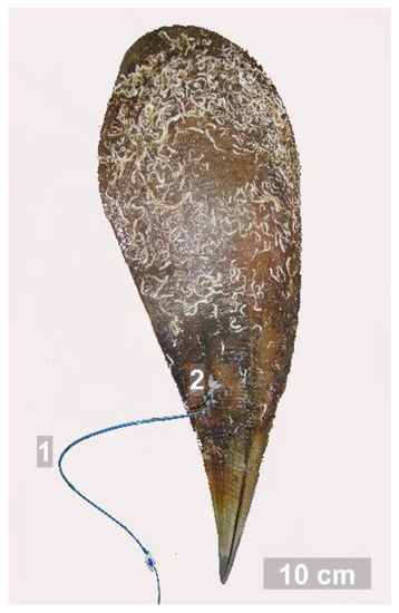 Pinna nobilis shell: 1—fiber-optic cable, 2—sensor attached above the heart area.